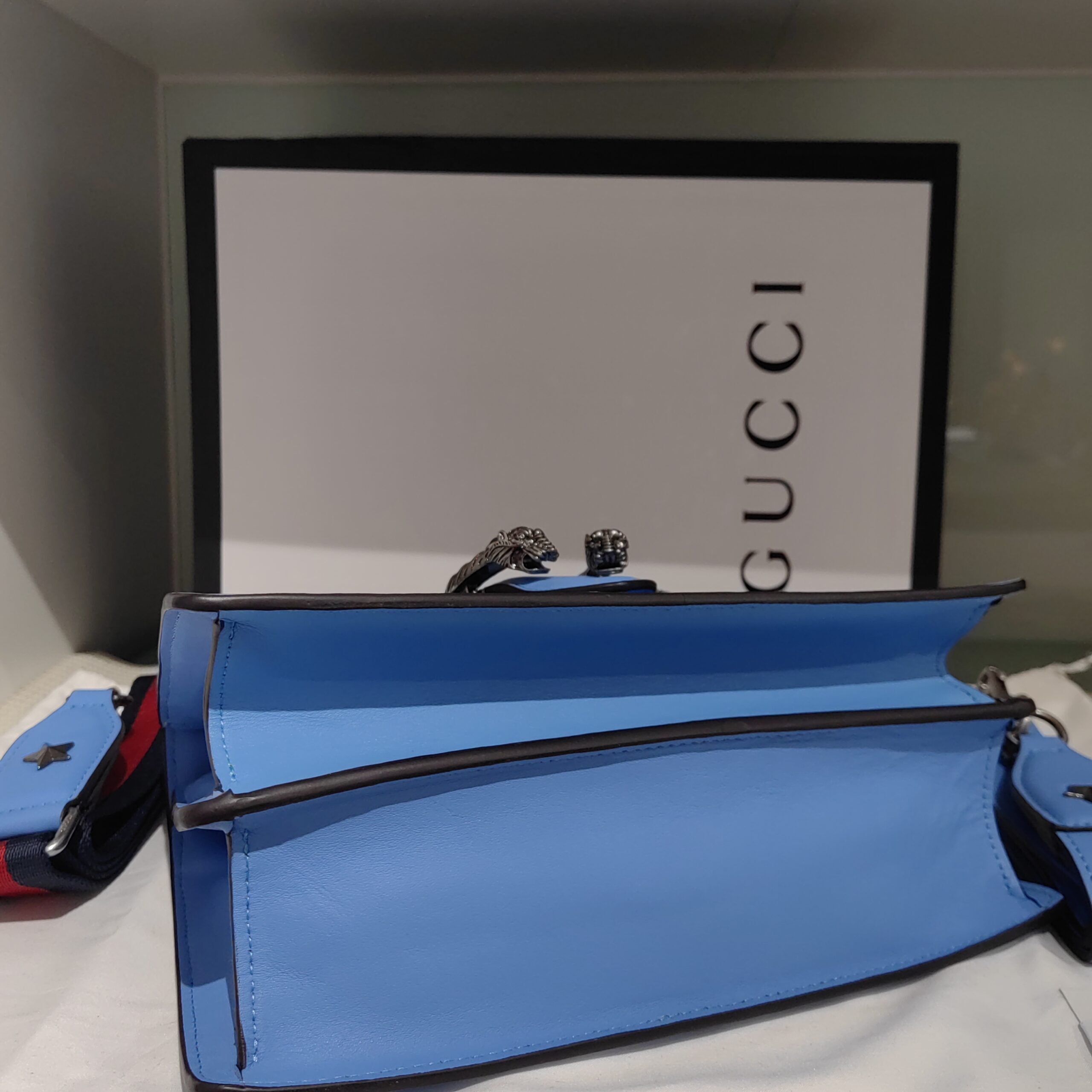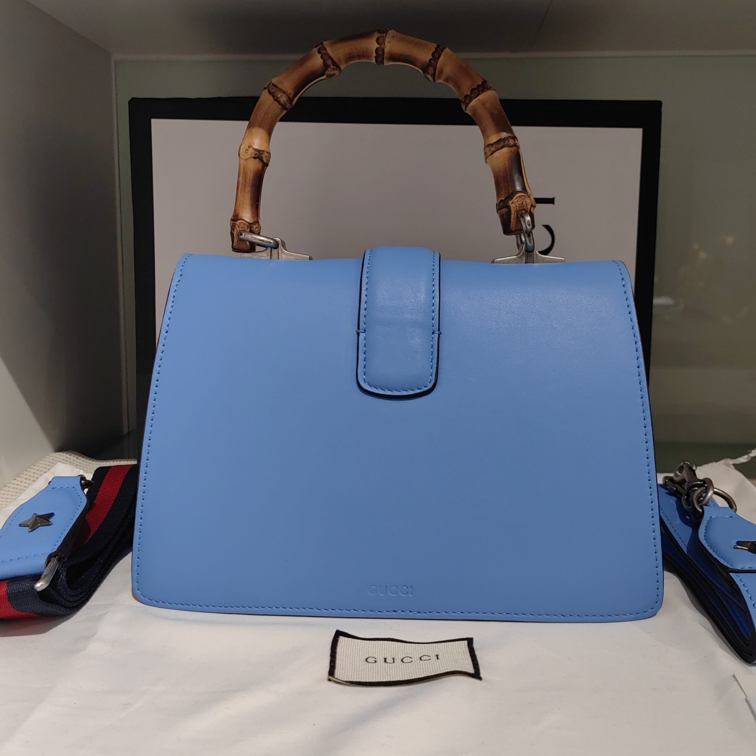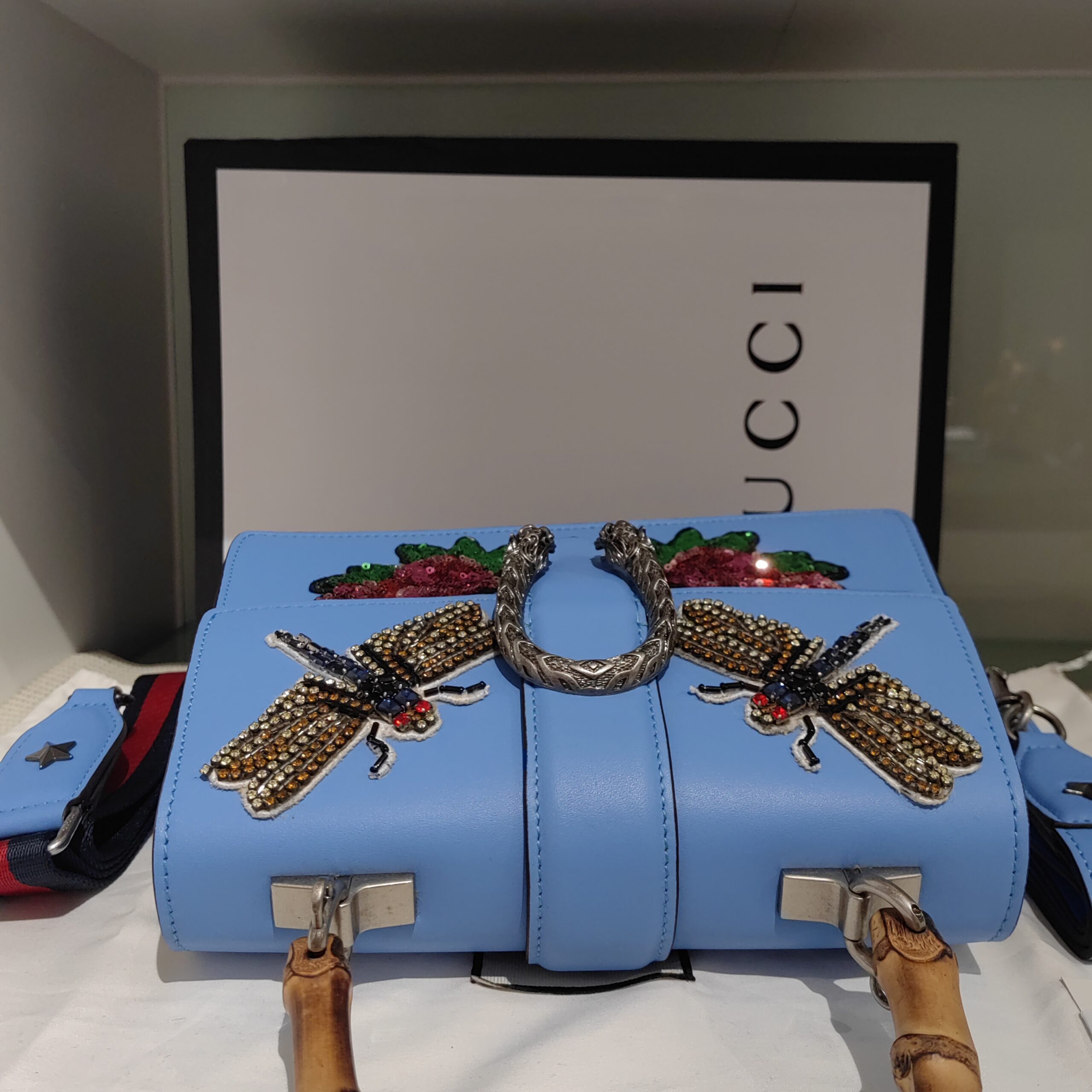 Dionysus Embroidered Blue Leather Bamboo Top Handle Bag